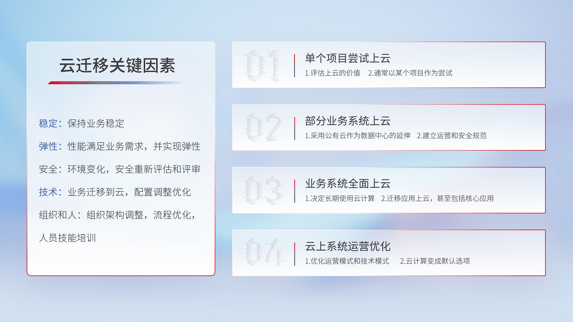 结合实际业务,,,从规划设计、、云平台选型、、云原生改造、、数据迁移、、集成交付,,迁移全过程为客户识别最佳上云路径,,,,做好风险识别管理,,,设计网络架构、、、身份权限、、安全审计合规、、、、操作审计、、、、日志审计、、监控告警策略、、、、多站点容灾设计等,,对云上基础设施进行整体规划,,提升IT治理水平,,,,以满足弹性、、高可用、、、高性能的需求。。